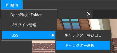 ポーズエディットやモーション変更、表情などを編集する対象のキャラクターを選択できます。 メニューバーの「Plugin>KISS>キャラクター選択」から開きます。