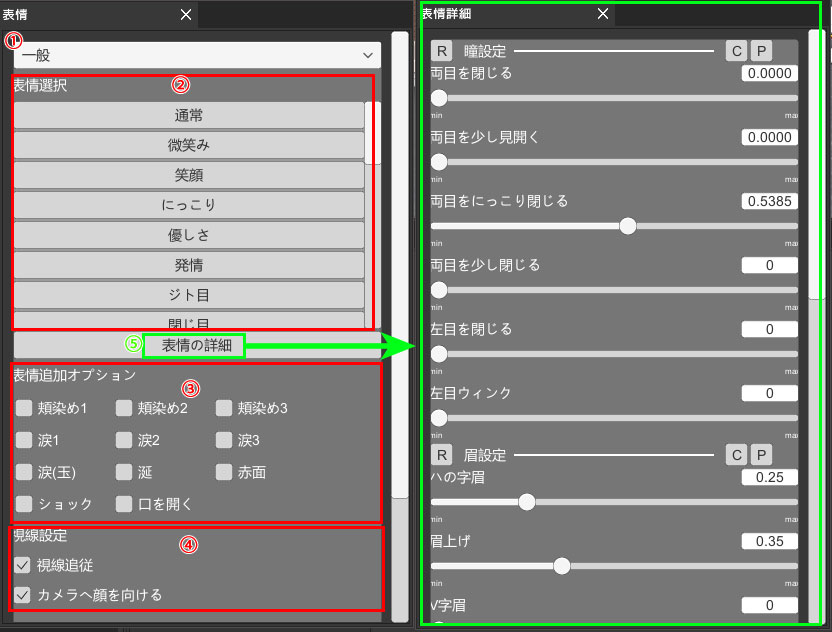 ②で選択した基本表情から更に顔の部位の細かい設定ができます。