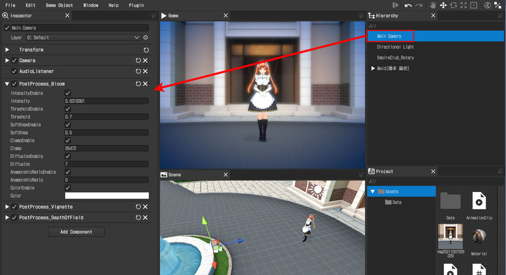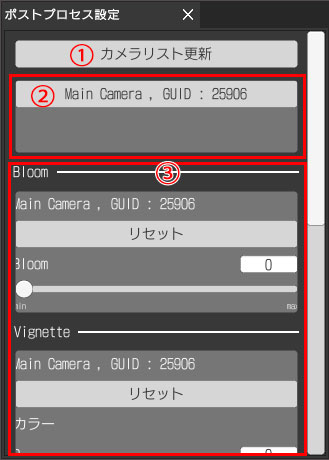 より詳細に設定したい場合はカメラのInspectorからポストプロセスコンポーネントを設定して下さい。
