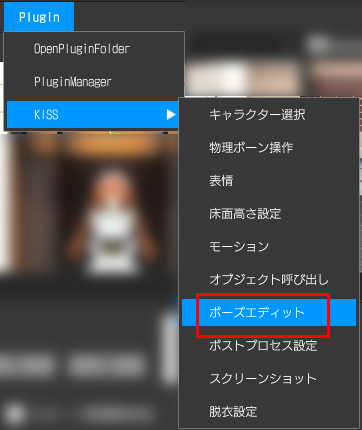 メニューバーから「Plugin>KISS>ポーズエディット」を開きます。