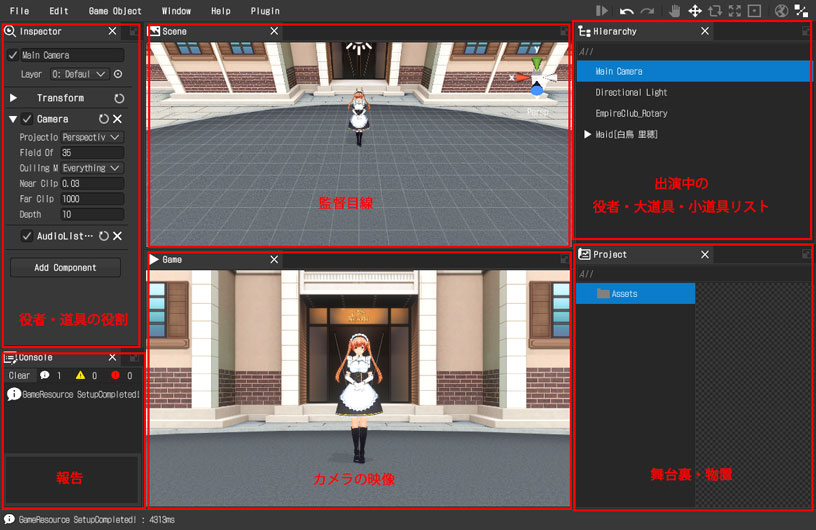 Sceneウィンドウのカメラ操作は実際の撮影されるGameウィンドウのカメラの操作とは別です。