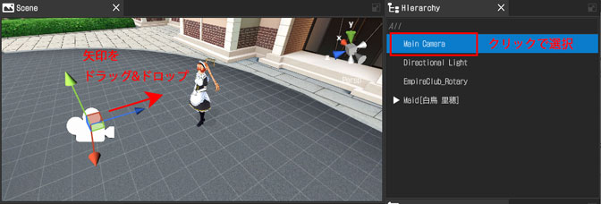 Hierarchyウィンドウで「Main Camera」をクリックして選択して、Scene上に表示される矢印のハンドルで操作してみましょう。