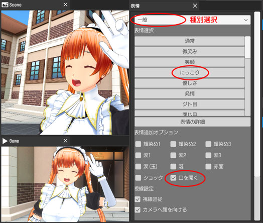 種別から「一般」を選んで、好きな表情を選択できます。表情の追加オプションで更に表情にバリエーションを付けられます。