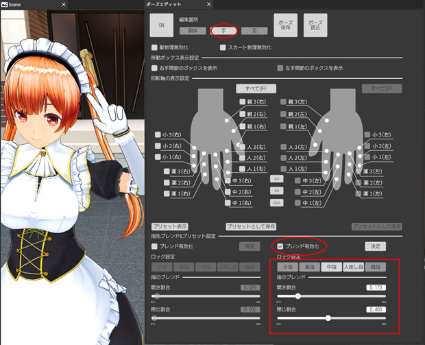 「手」の項目を開いて、操作したい方の手の「ブレンド有効化」を押して、「開具合」と「綴じ割合」スライダーを動かして見よう。