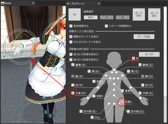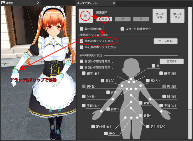 ポーズエディットウィンドウの「ON」から「胴体」「関節ボックスを表示」を押して、関節を直接ドラッグ&ドロップで移動してみましょう。