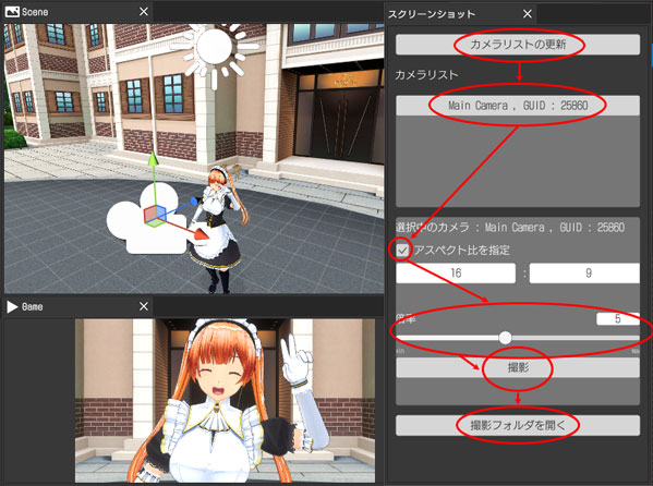 Main Cameraが映している「Game」ウィンドウの内容が画像ファイルに保存されますので、「撮影フォルダを開く」を押して確認して下さい。