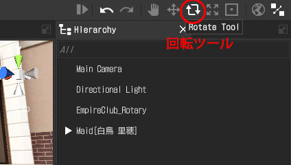 Hierarchyウィンドウで「Main Camera」をクリックして選択して、Scene上に表示される回転のハンドルで操作してみましょう。